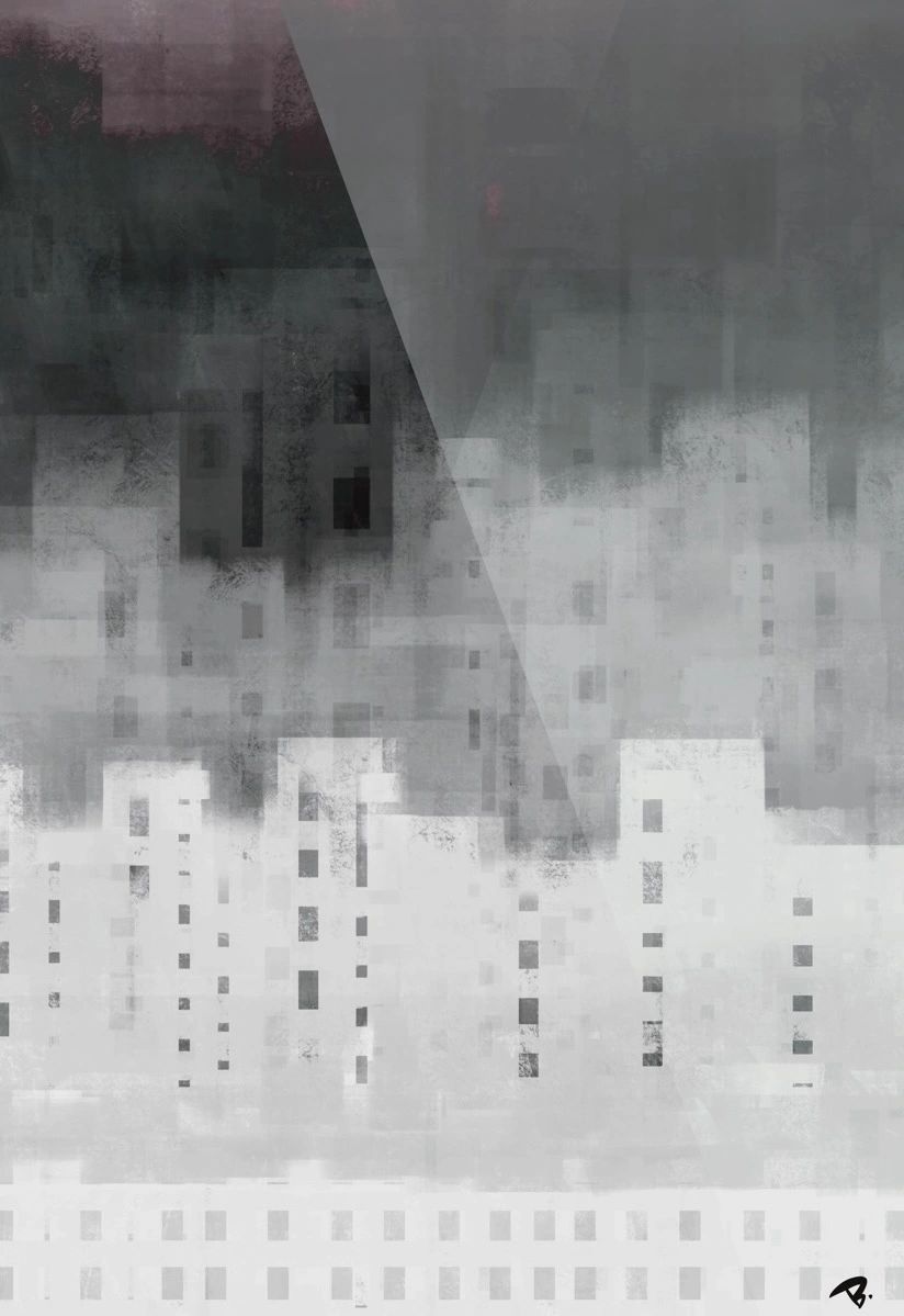 The composition reads as both architectural and psychological. Vertically stacked grids suggest high-rise apartments or data matrices, but their boundaries blur into each other, creating a sense of ambiguity — of a city perpetually in flux, half-formed, half-erased. A diagonal incision bisects the image, a subtle act of violence that divides the scene yet binds it together compositionally. It functions as a fault line, perhaps alluding to the fracture points of modernity — social inequality, digital disconnection or environmental collapse.
